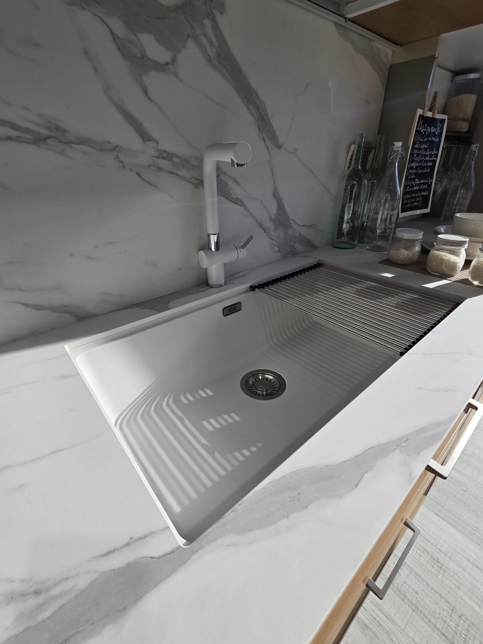 - Top: HPL in Calacatta antigraffio e lavello integrato