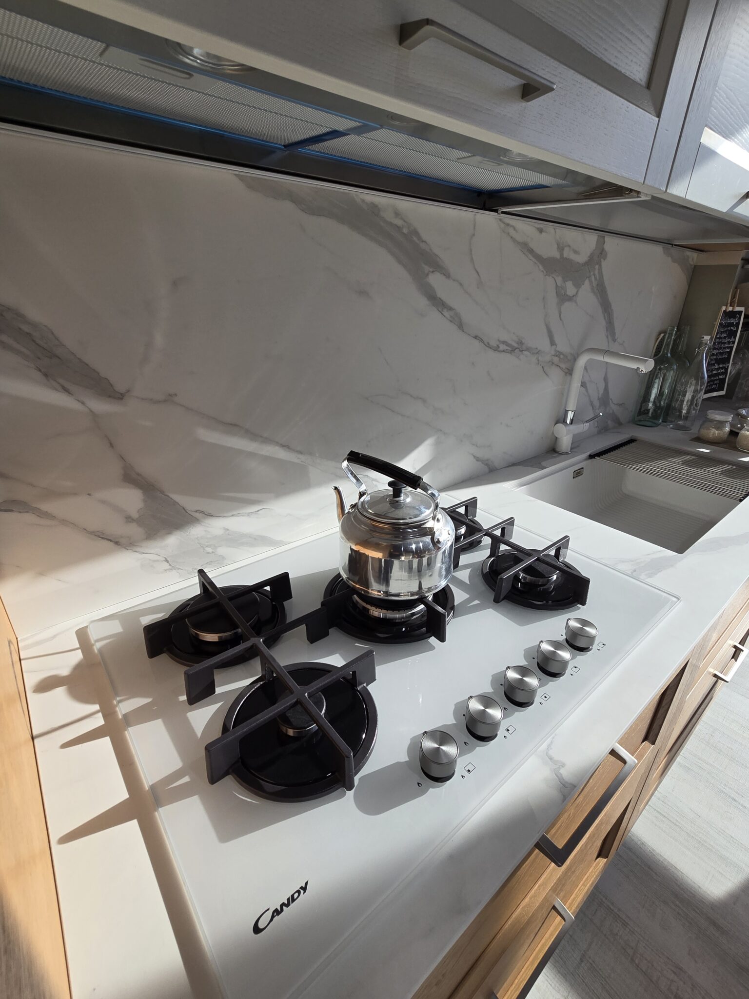- Piano cottura: 5 fuochi cm 75, vetro bianco